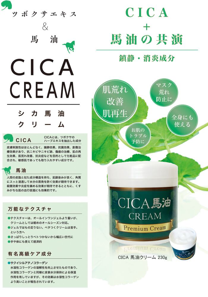 *話題のツボクサキス(CICA)、馬油をメインコンセプト成分として配合した大容量クリームです。